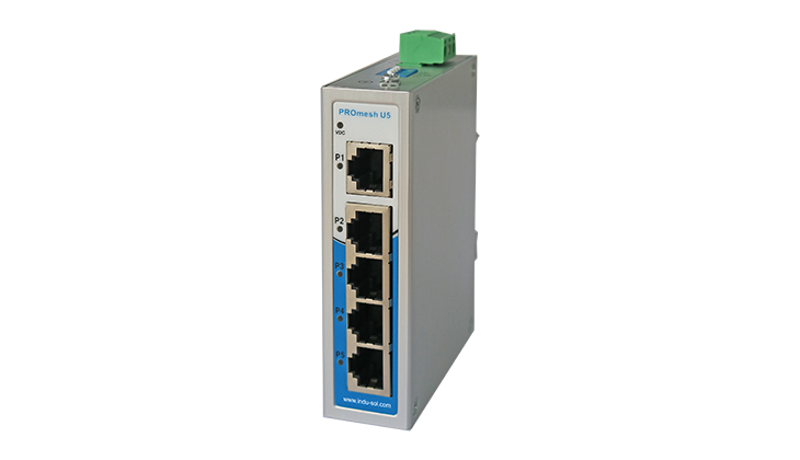PROmesh U5 专为 PROFINET 应用设计,也可用于其他基于以太网的网络。它配备五个 RJ45 端口,可实现高效的网络配置。该设备是工业自动化项目的理想选择。通过 DIP 开关,可启用并使用“一键 VLAN”和“流量控制”等附加功能。